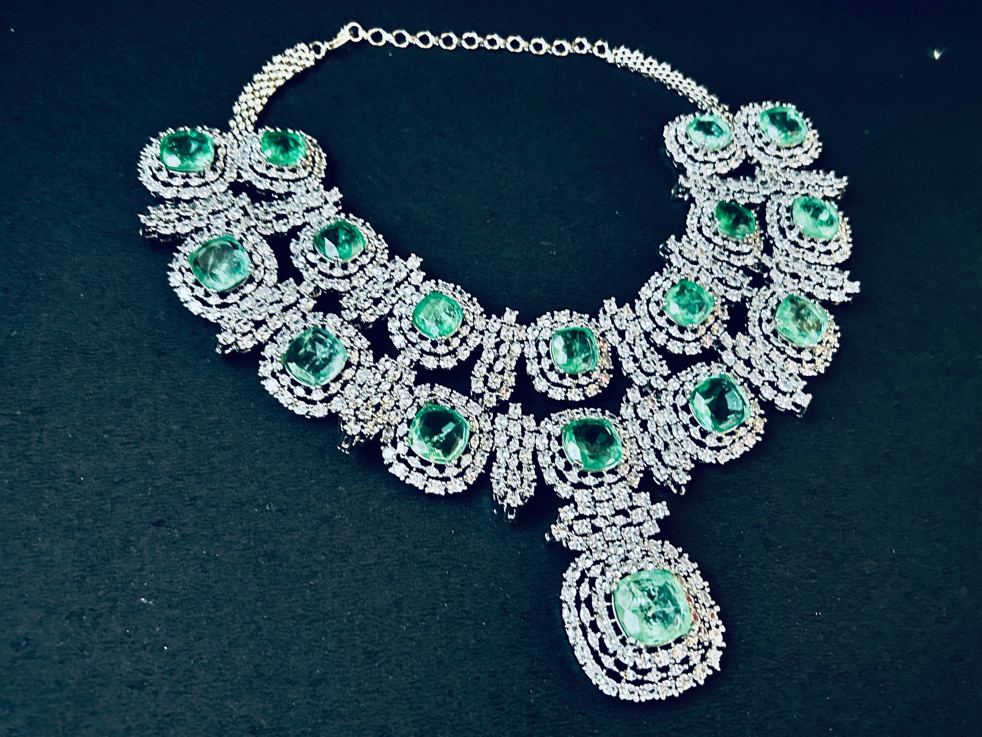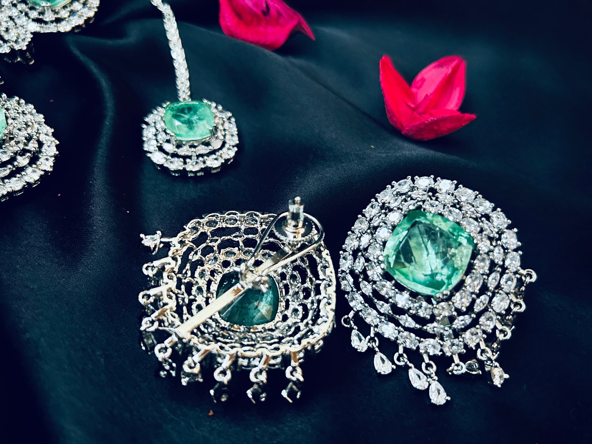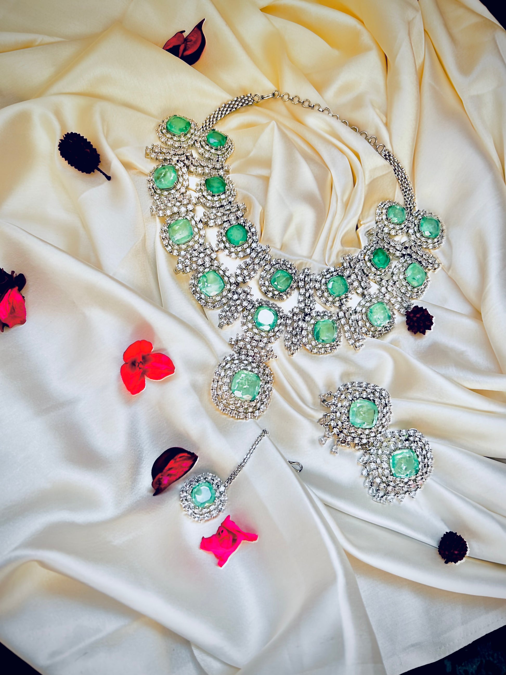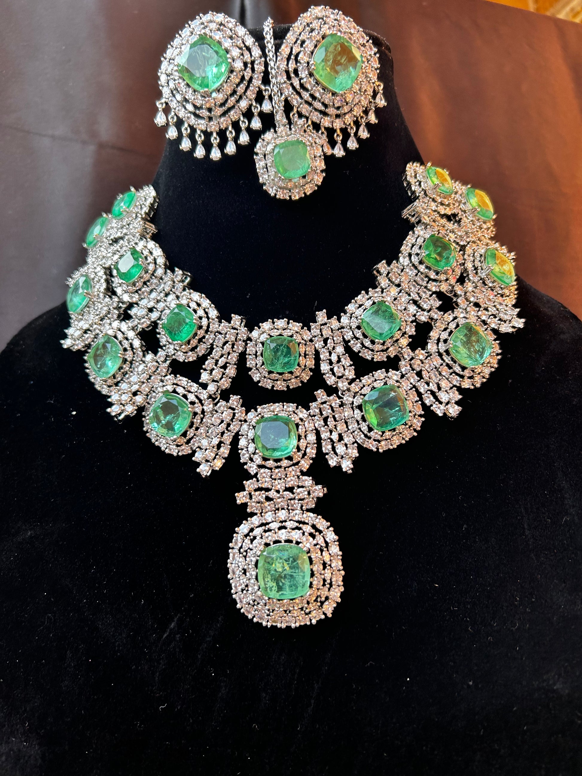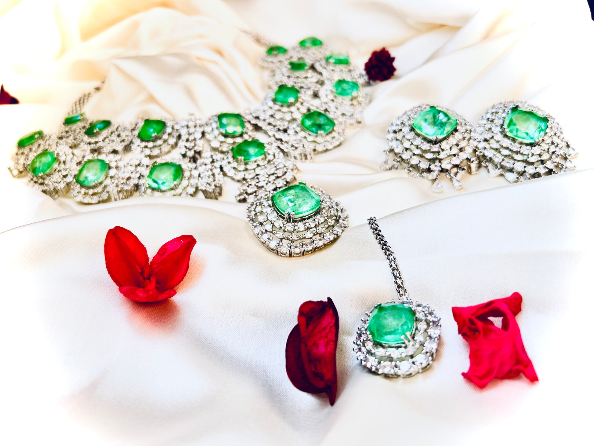 "Dazzling in American diamonds and glass stones, alia's exquisite necklace set, complete with a majestic mang tika and matching earrings, steals the spotlight."