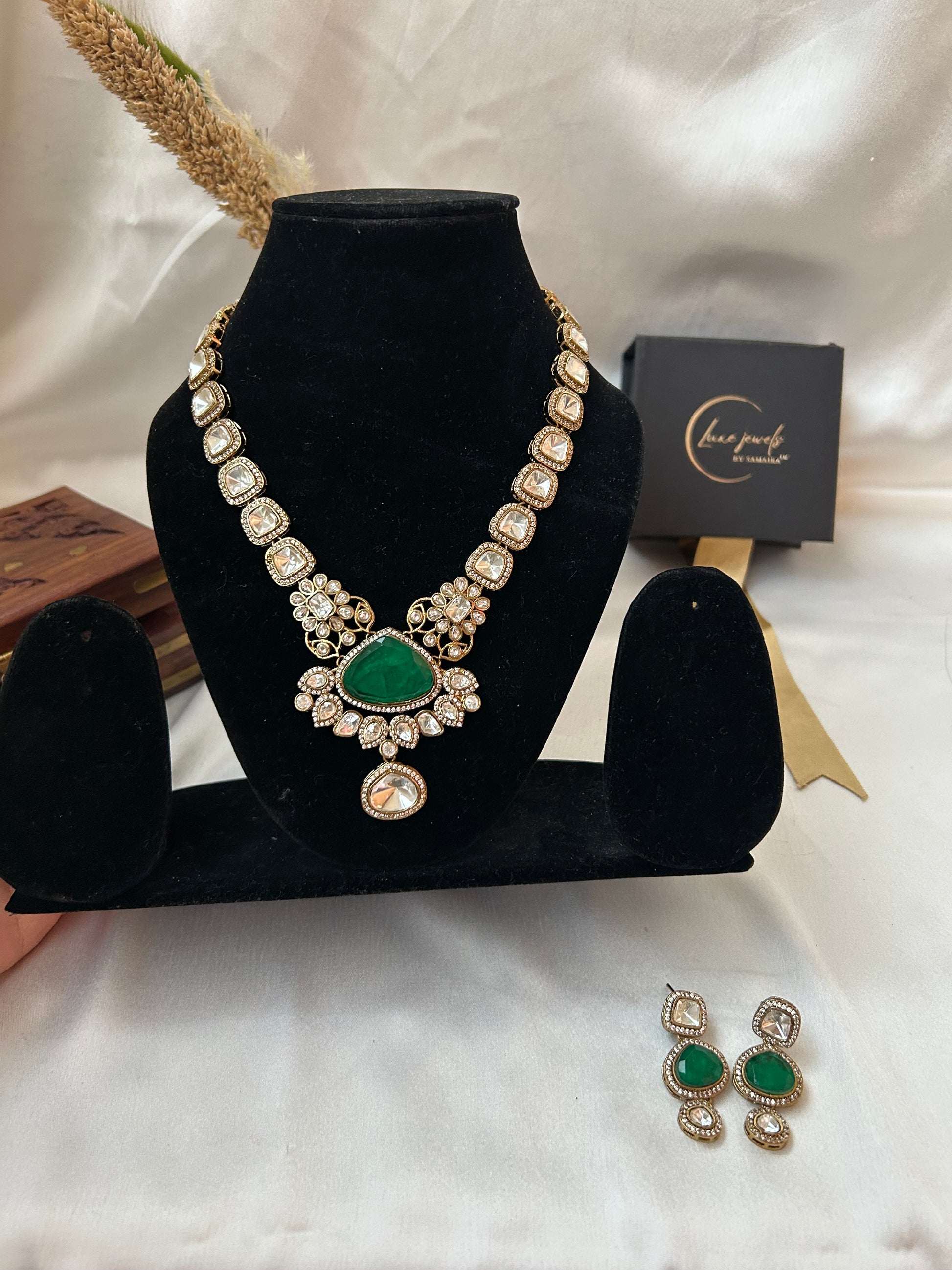 Elevate your elegance with this exquisite Kundan necklace set, featuring a stunning combination of traditional craftsmanship and modern luxury. The necklace is adorned with uncut polki-style Kundan stones, meticulously arranged in a graceful pattern, leading to a mesmerizing green stone centerpiece. The delicate floral detailing and a dangling Kundan pendant add a regal touch.