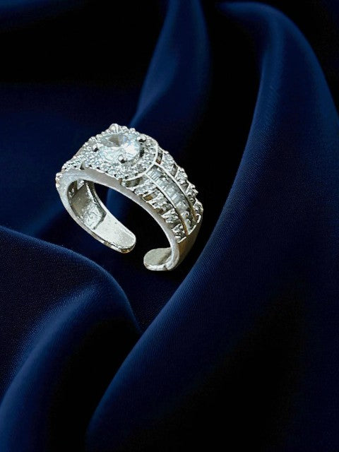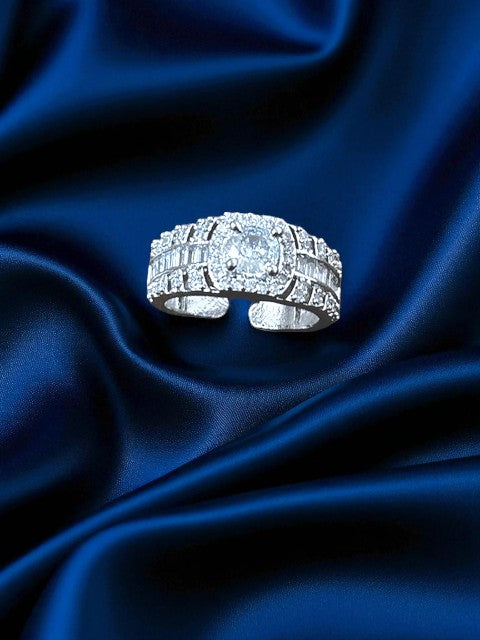 Step into the spotlight with this luxurious cocktail ring, designed to turn heads with its exquisite grandeur. Crafted with a bold emerald-cut centerpiece embraced by a stunning double halo of meticulously set stones, this ring speaks of elegance and confidence. The intricately detailed band features a unique split shank design adorned with shimmering accents, adding dimension and brilliance from every angle. Perfect for elevating evening ensembles, celebratory occasions, or simply indulging your love for standout jewelry.