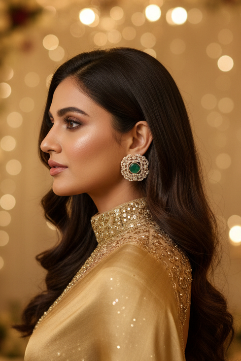 Bold, royal, and breathtaking — these round emerald studs are surrounded by a halo of golden and white stones that resemble a bejeweled crown. A must-have for those who love vintage drama with a modern sparkle.
