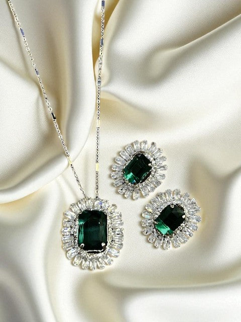 A timeless blend of luxury and sophistication, the Emerald Ice Queen Set features a deep green emerald-cut stone, crowned with a radiant halo of American diamonds. The sparkling earrings and pendant are crafted in a silver-tone finish, evoking the charm of royal heirlooms with a modern twist.