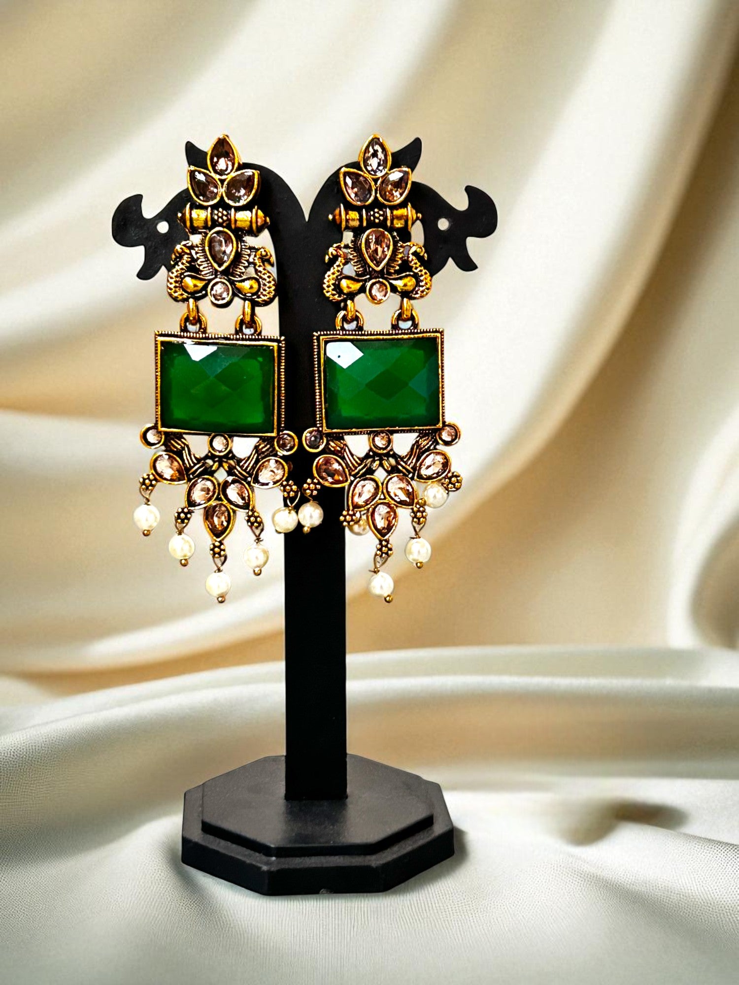 Adorn your festive look with these regal long earrings, crafted in an antique gold finish. Featuring a majestic emerald-green faceted centre stone, surrounded by delicate champagne kundan accents and finished with clusters of soft pearl drops. The intricate floral and paisley design evokes royal heritage, perfect for weddings and grand occasions.