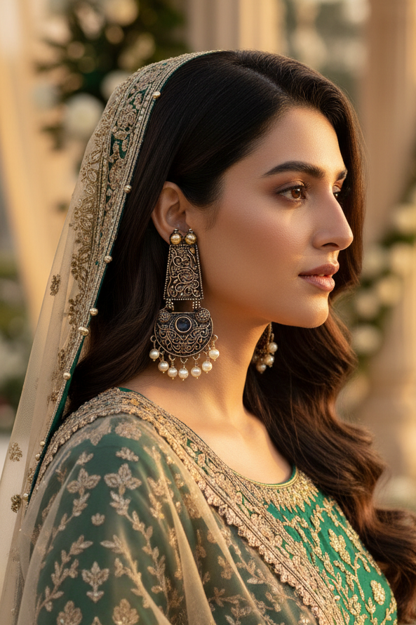 A perfect blend of antique gold finish and Indo-modern design, these earrings boast a textured scallop pattern and black stone top, finished with soft pearl drops. Dramatic yet classy, they elevate ethnic wear with ease.