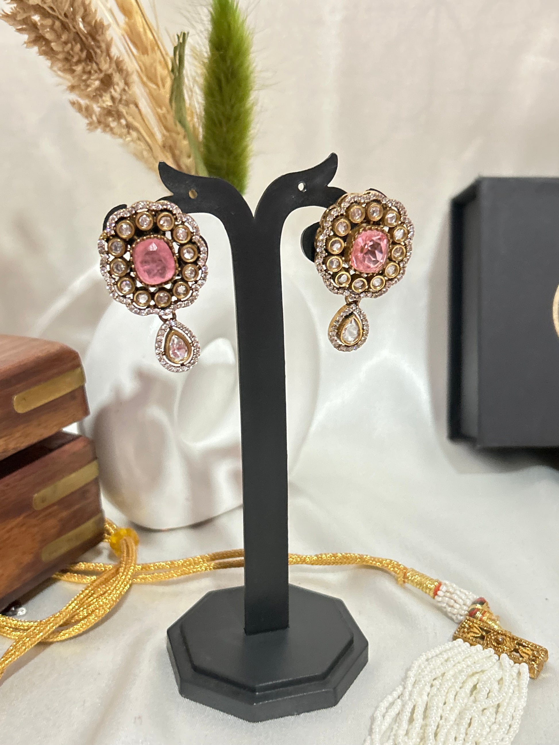 ✨ **Matching Earrings:** Statement stud earrings with a central pink stone, surrounded by intricate kundan work and a teardrop dangle for added charm.
