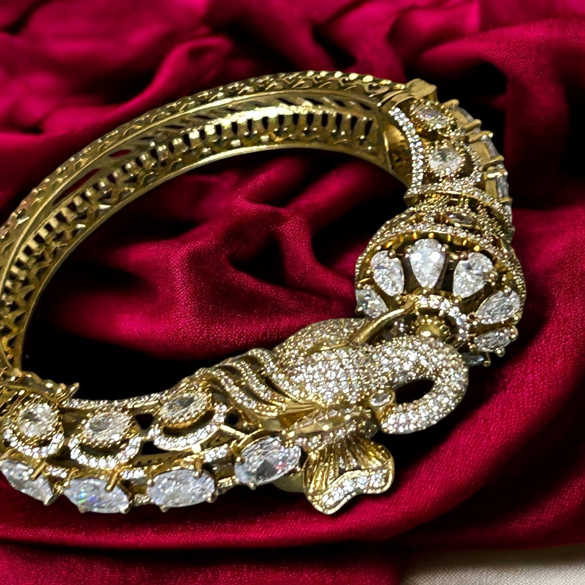 A unique elephant bracelet with traditional motifs and antique gold finish. The detailed elephant engravings add a vintage touch while the golden enamel enhances its ethnic grace.