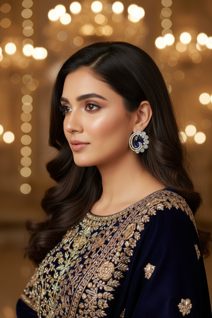 Dive into elegance with these navy blue oval studs encircled by delicate floral motifs and sparkling diamonds. The swirling silver vines give them a whimsical, fairytale touch. Ideal for evening affairs and graceful festive looks.