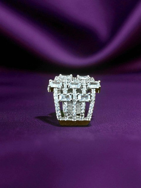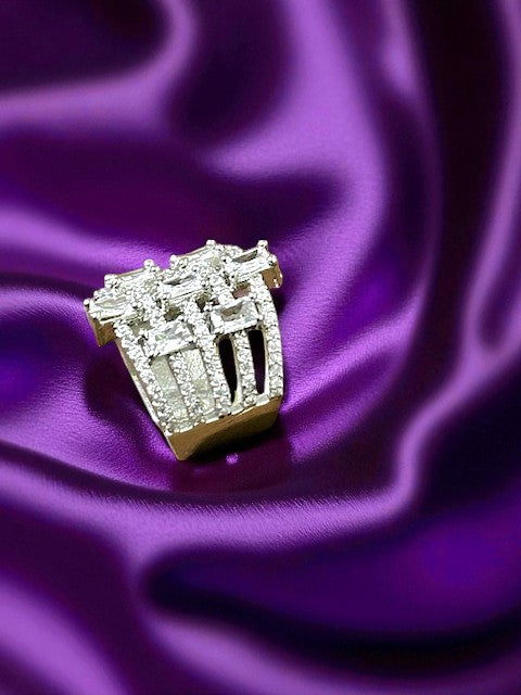 Step into the spotlight with this luxurious cocktail ring, designed to turn heads with its exquisite grandeur. Crafted with a bold emerald-cut centerpiece embraced by a stunning double halo of meticulously set stones, this ring speaks of elegance and confidence. The intricately detailed band features a unique split shank design adorned with shimmering accents, adding dimension and brilliance from every angle. Perfect for elevating evening ensembles, celebratory occasions, or simply indulging your love for standout jewelry.
