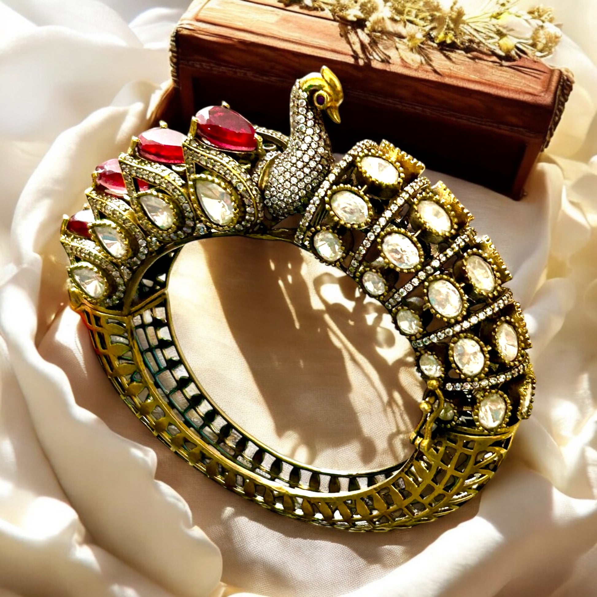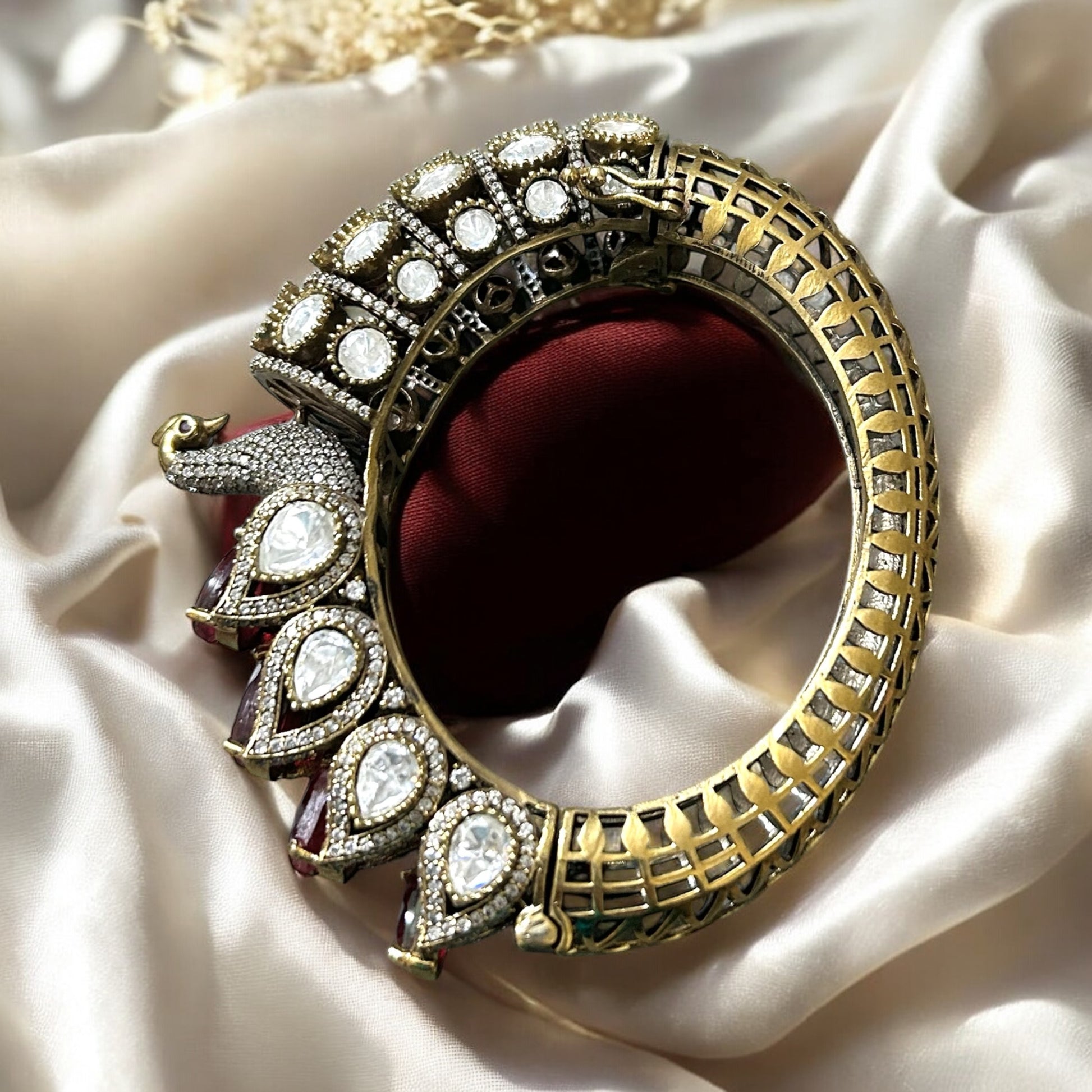 Pair it with a silk saree, lehenga, or even a solid-color kurta set for a royal touch. Avoid wearing similar bold bangles next to it – let it shine on its own.